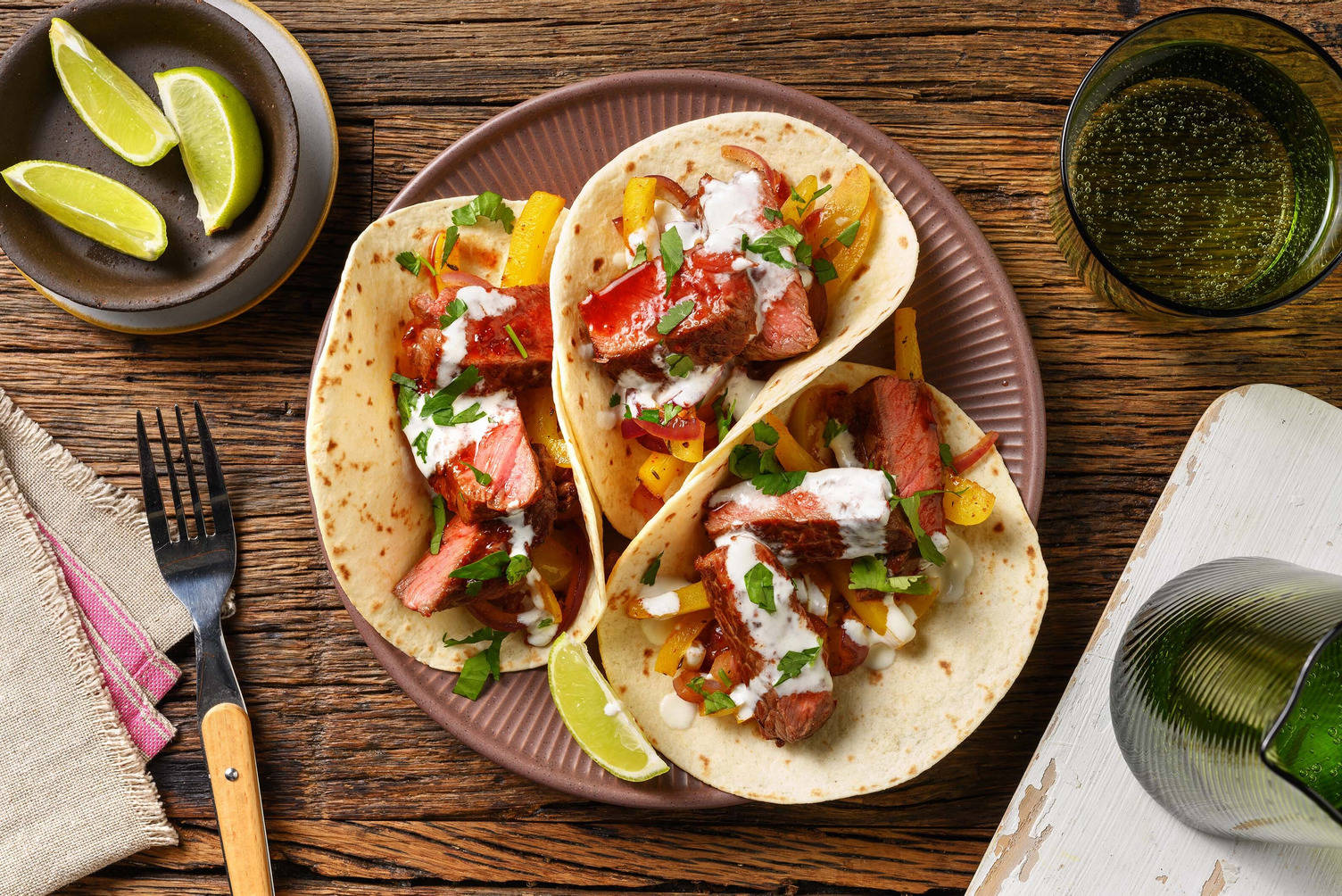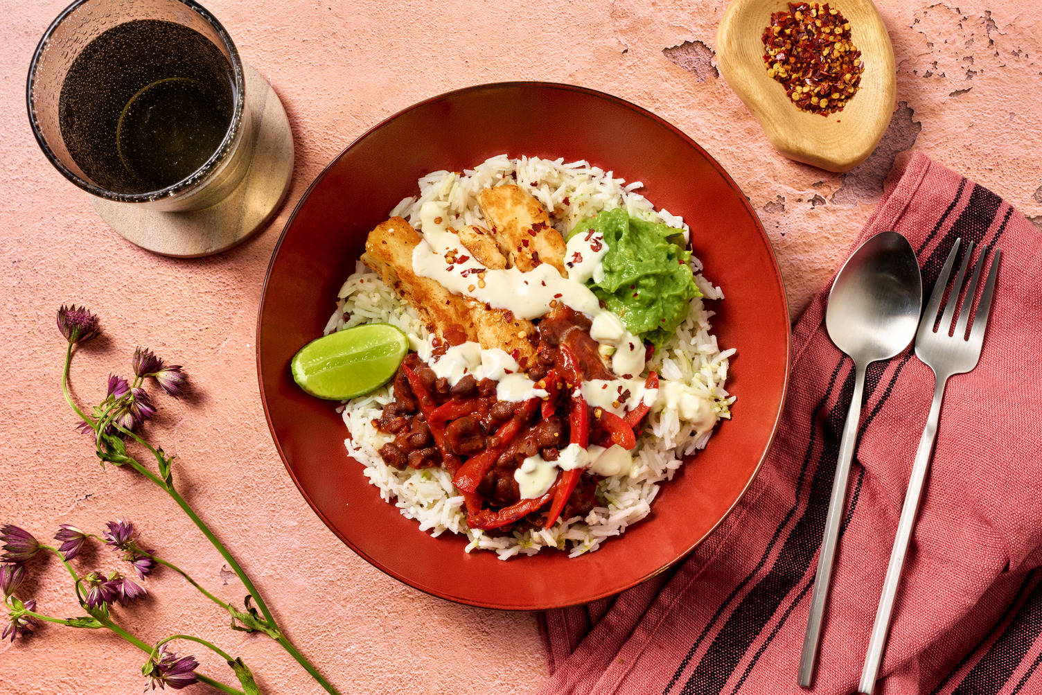 Horchata (a rice-based drink), agua fresca (fruit-infused water), or fresh lime margaritas are great pairings for Mexican dishes.